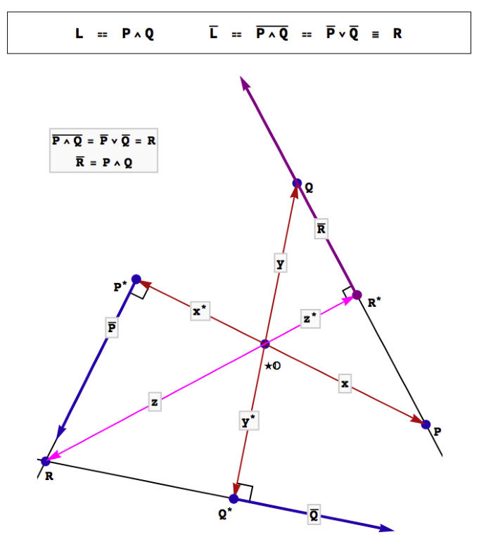 In the plane, the complement of a point is a line, and the complement of a line is a point. If a line is defined by two points, then its complement is the intersection of the complements of the points. The graphic below shows these relationships, with x, y and z the position vectors of three points. Inverses of points and vectors are indicated with *-superscripts. In higher dimensional spaces, the same relationships hold but their interpretations are different. For example in a bound 3-space the complement of a point is a plane and the complement of a plane is a point. The complements of two points P and Q yield two planes which intersect in a line R whose complement passes through the points P and Q.
