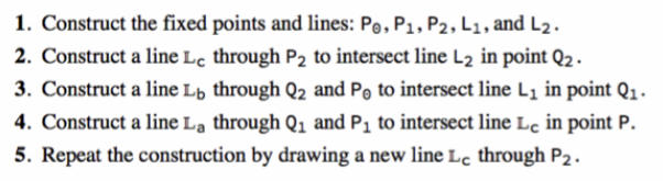 A geometric equation, either as a series of steps, or in its final form can be used as a prescription to construct a curve or surface. In the case below, the equation can be viewed as a prescription to construct a conic section in the plane. An exterior product of points means "draw a line through the points". A regressive product of lines means "find their point of intersection". Construct an ellipse from the equation below by working from left to right.